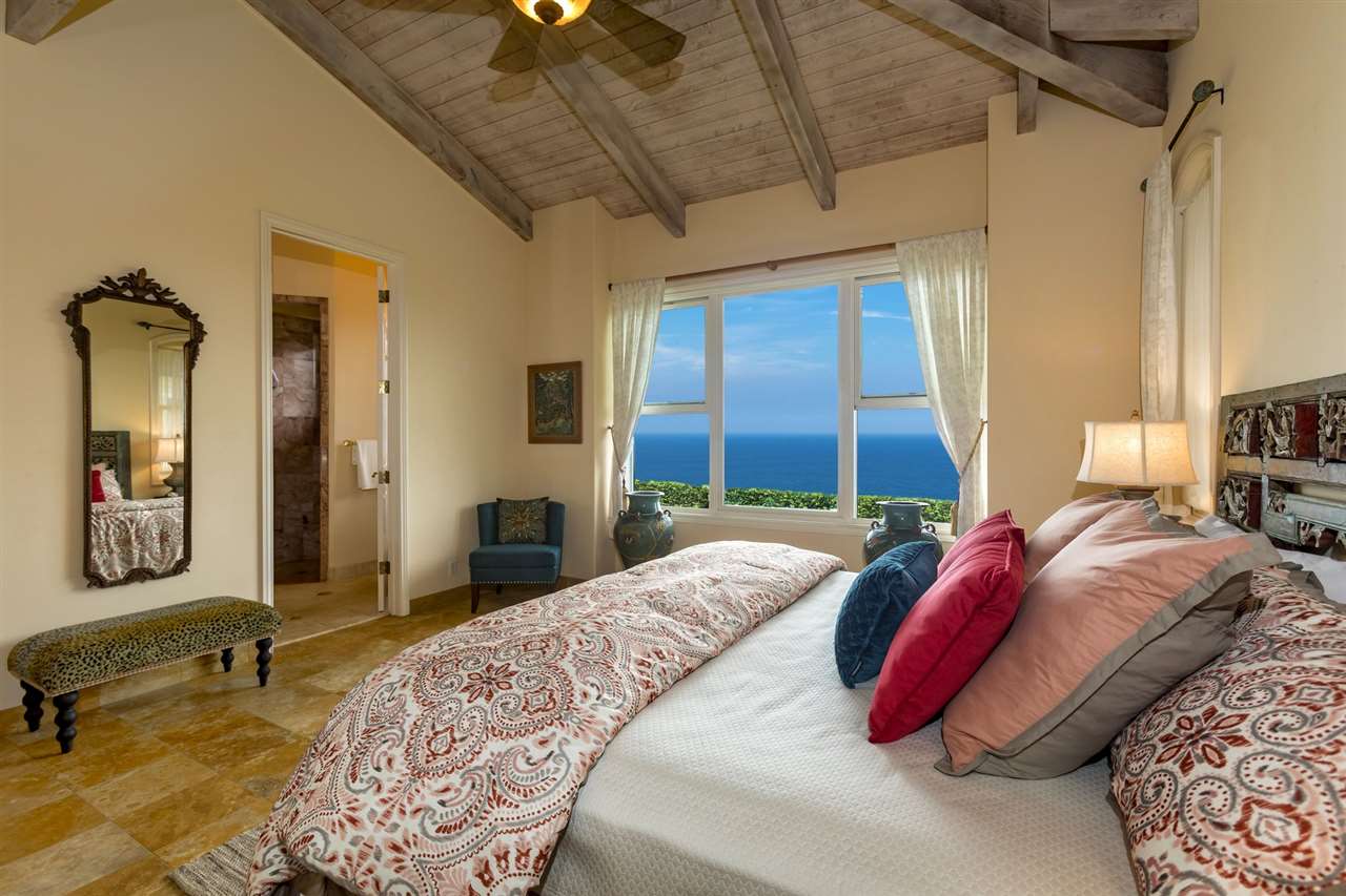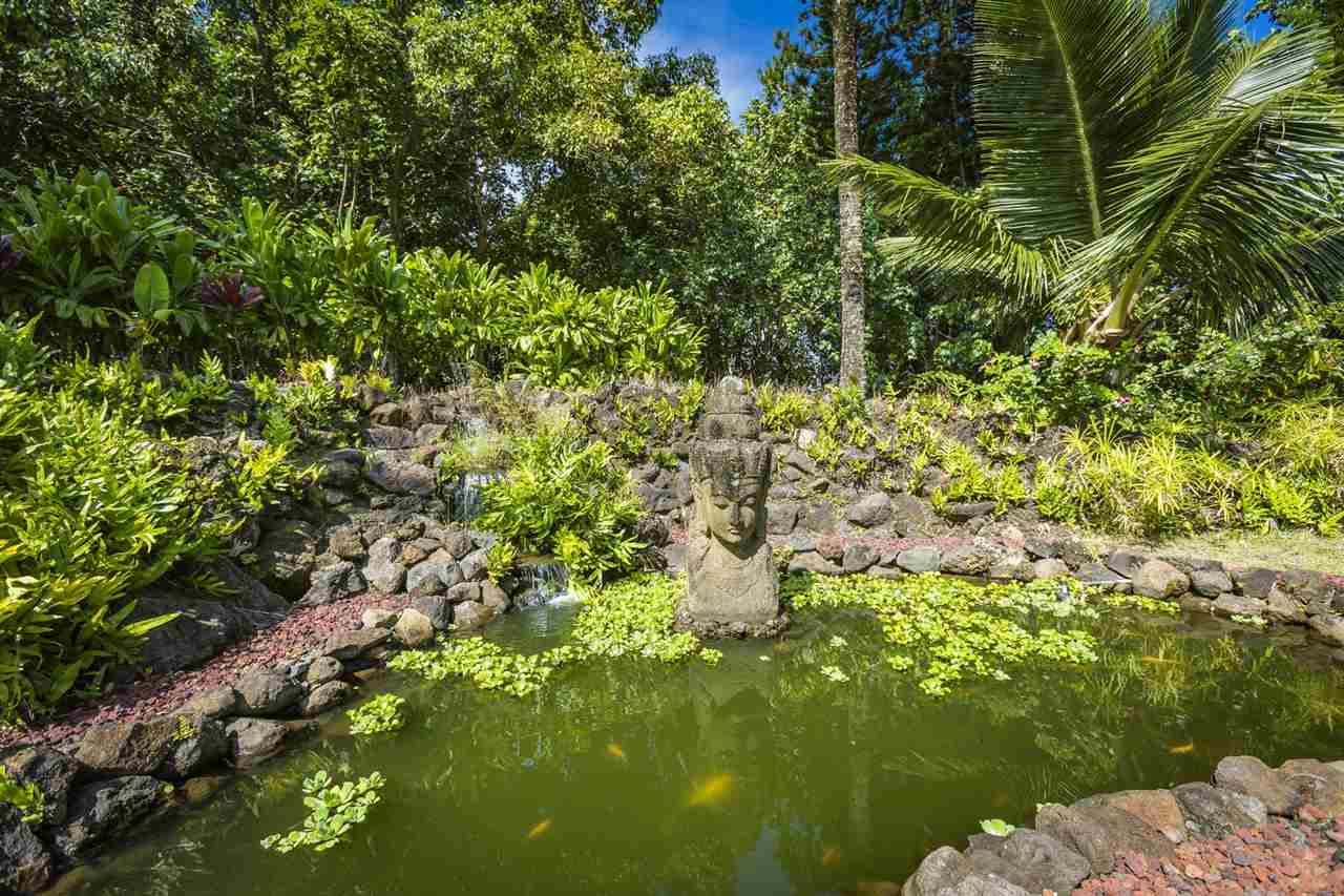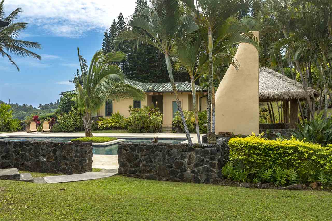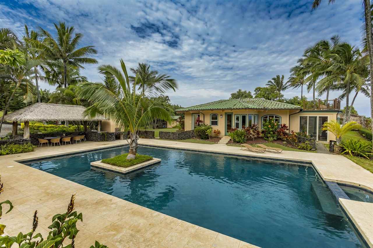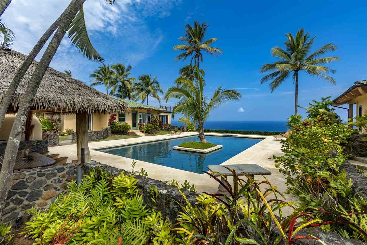 Set upon the magnificent cliffs of Waipio Bay, an oceanfront villa. Gracious & gated, the 9.82 acreage embraces solitude & seclusion. A stately palm lined drive, sprawling green lawns & flora as a flowing stream received you. A welcoming entrance extends to a single level home featuring expansive views of the blue Pacific, which are dynamic. Drawing you through the open floor plan, captivating views are ever present. A lovely country home with simplistic comforts & conveniences with pizazz. A gourmet kitchen, with European flair, where notable chefs have enjoyed memorable meals. The exterior settings propose features to reflect or to be active/engaged with family. The saline pool (with hot tub & cabana bath) craft an atmosphere of fitness or relaxation. An exhilarating venue for entertaining under the elongated Hawaiian pavilion featuring a brick pizza oven. A viewing deck for 'on top of the world' experiences. Hike to your own waterfall. Sport a round of 3 par golf, on site. Sway in an ocean breeze cradled within a hammock. The additional delightful ocean side cottage is a 'spa like' accommodation for guests. With sustainability in mind, a private well, water catchment, solar electric, Tilapia fish pond, fruit trees, & terraced vegetable gardens bring fulfillment. 20 miles from the airport, this rural locale offers discretion, privacy & quiet. An opportunity to retain one of Maui's most inimitable estates, all within a reasonable journey to local amenities.