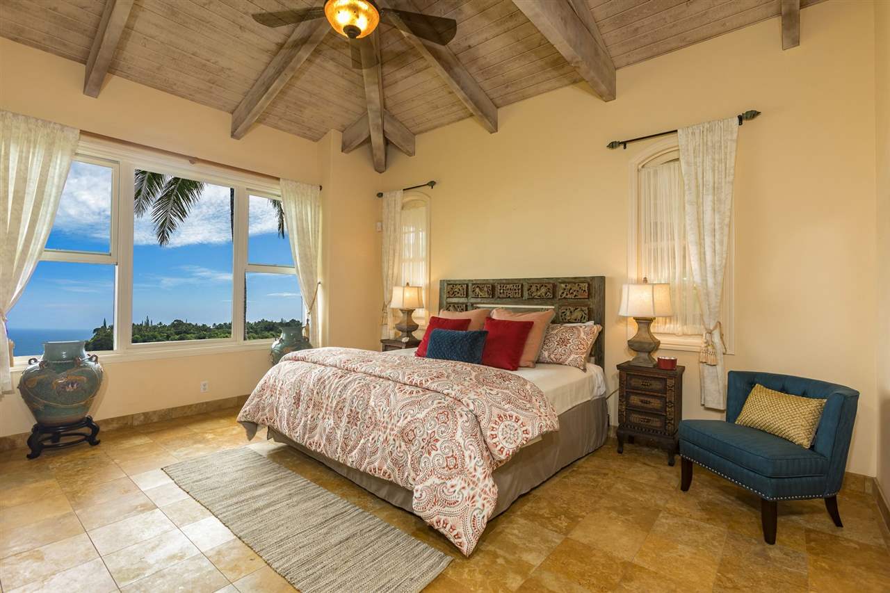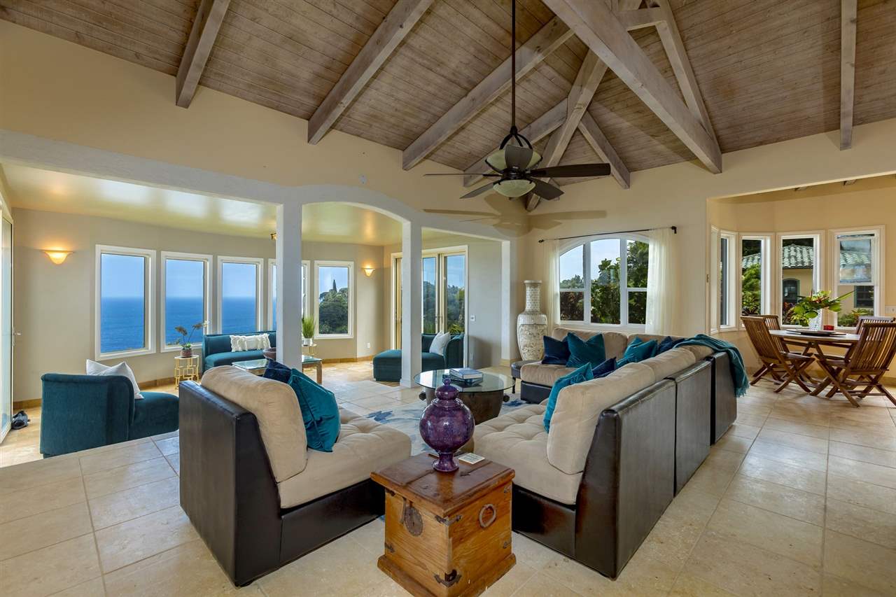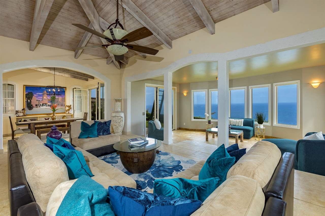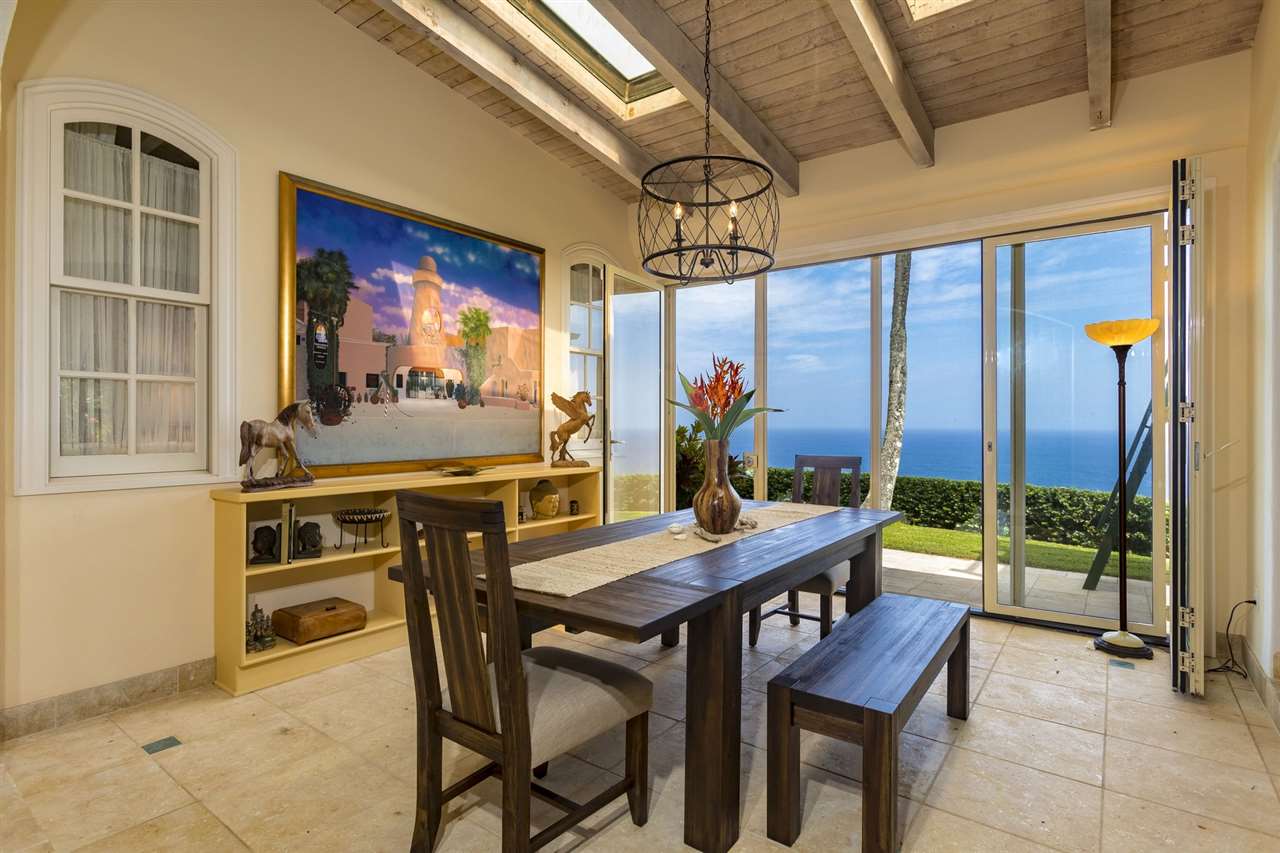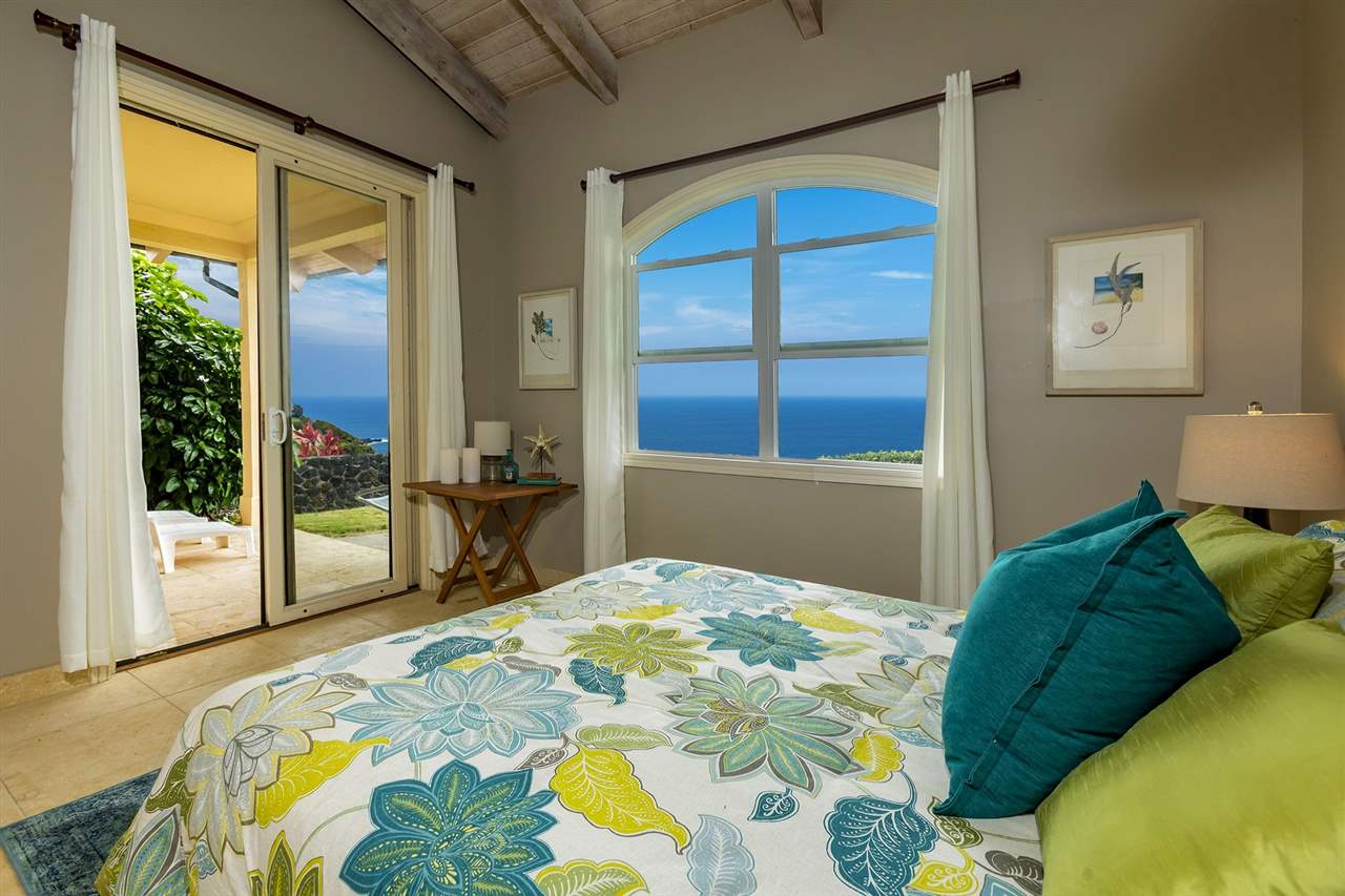 Set upon the magnificent cliffs of Waipio Bay, an oceanfront villa. Gracious & gated, the 9.82 acreage embraces solitude & seclusion. A stately palm lined drive, sprawling green lawns & flora as a flowing stream received you. A welcoming entrance extends to a single level home featuring expansive views of the blue Pacific, which are dynamic. Drawing you through the open floor plan, captivating views are ever present. A lovely country home with simplistic comforts & conveniences with pizazz. A gourmet kitchen, with European flair, where notable chefs have enjoyed memorable meals. The exterior settings propose features to reflect or to be active/engaged with family. The saline pool (with hot tub & cabana bath) craft an atmosphere of fitness or relaxation. An exhilarating venue for entertaining under the elongated Hawaiian pavilion featuring a brick pizza oven. A viewing deck for 'on top of the world' experiences. Hike to your own waterfall. Sport a round of 3 par golf, on site. Sway in an ocean breeze cradled within a hammock. The additional delightful ocean side cottage is a 'spa like' accommodation for guests. With sustainability in mind, a private well, water catchment, solar electric, Tilapia fish pond, fruit trees, & terraced vegetable gardens bring fulfillment. 20 miles from the airport, this rural locale offers discretion, privacy & quiet. An opportunity to retain one of Maui's most inimitable estates, all within a reasonable journey to local amenities.