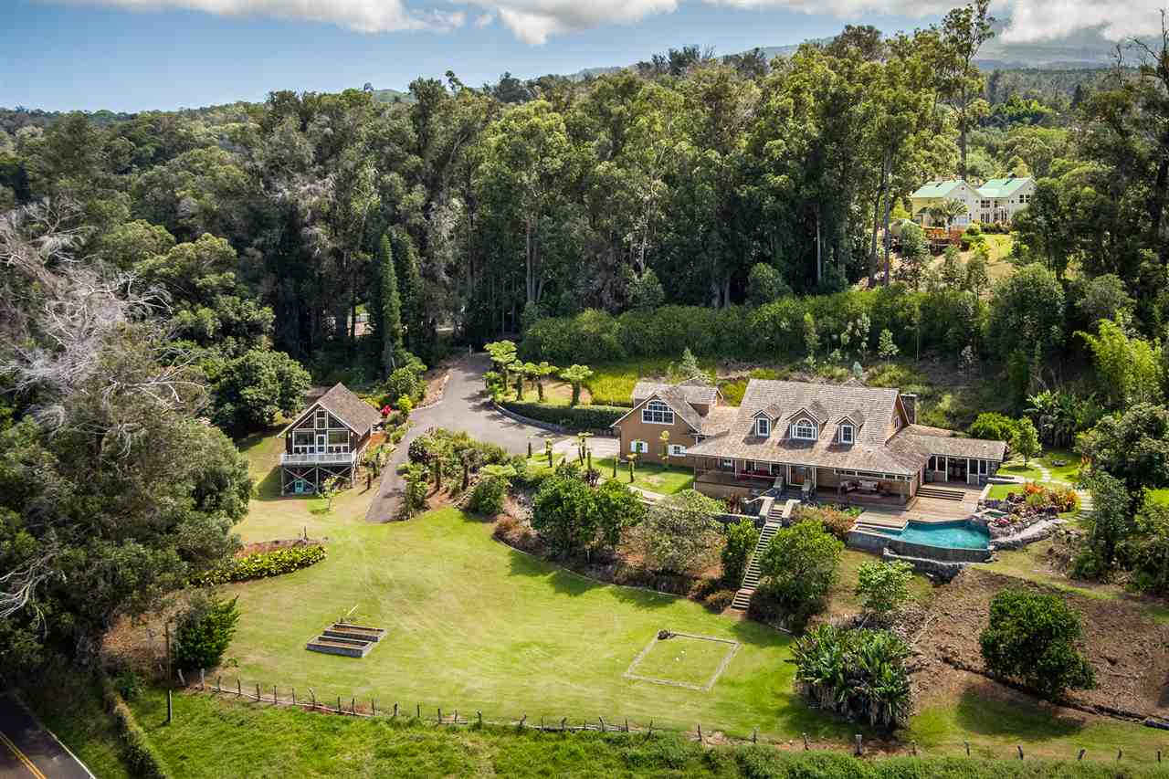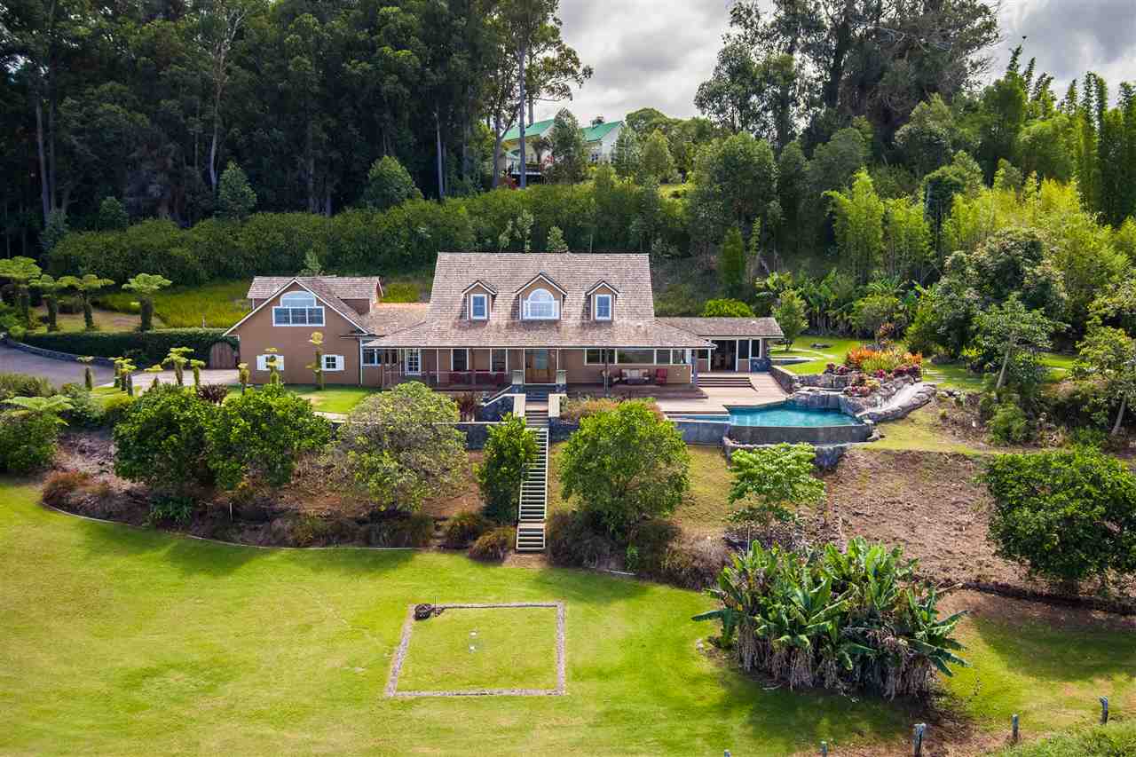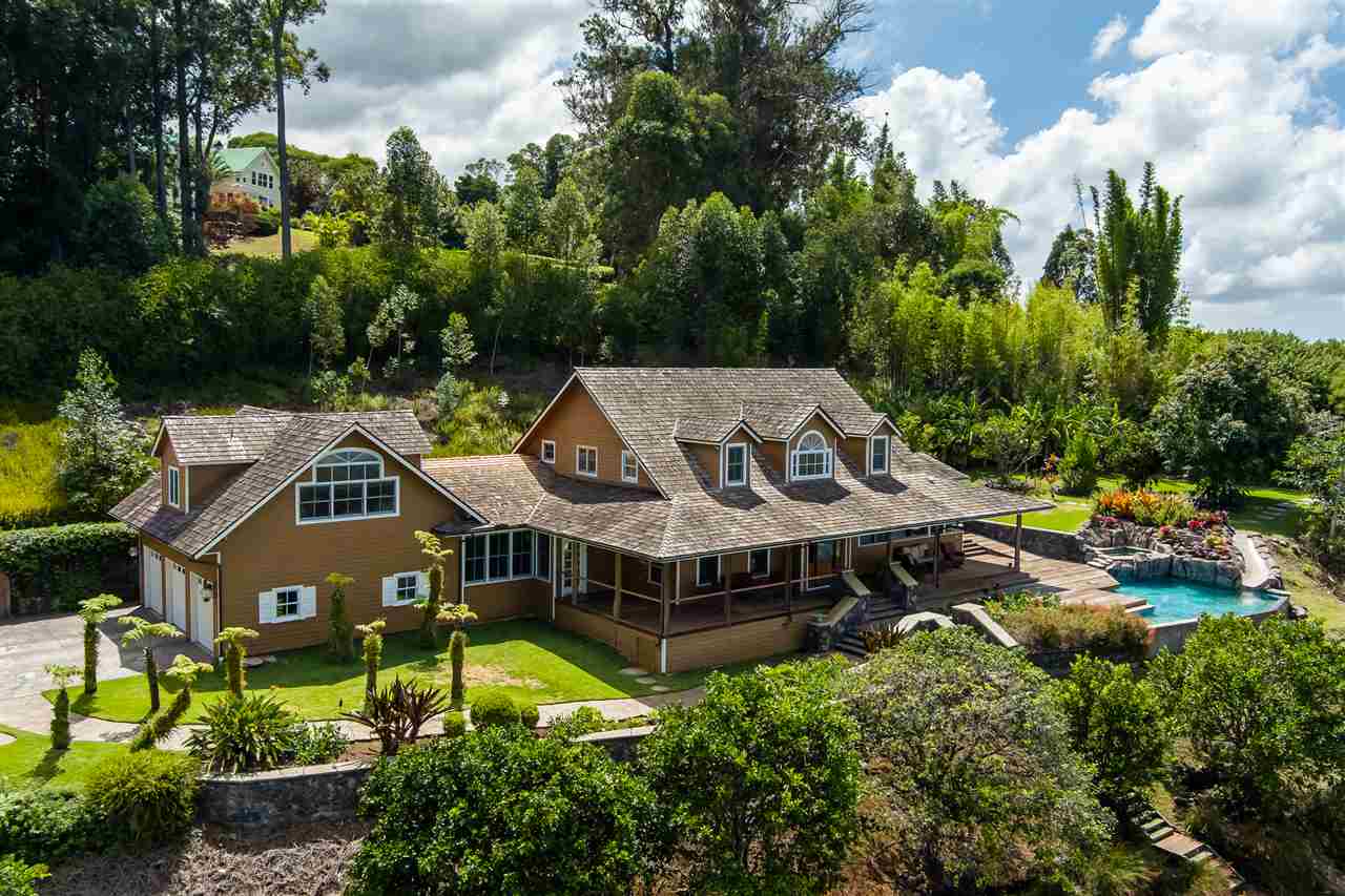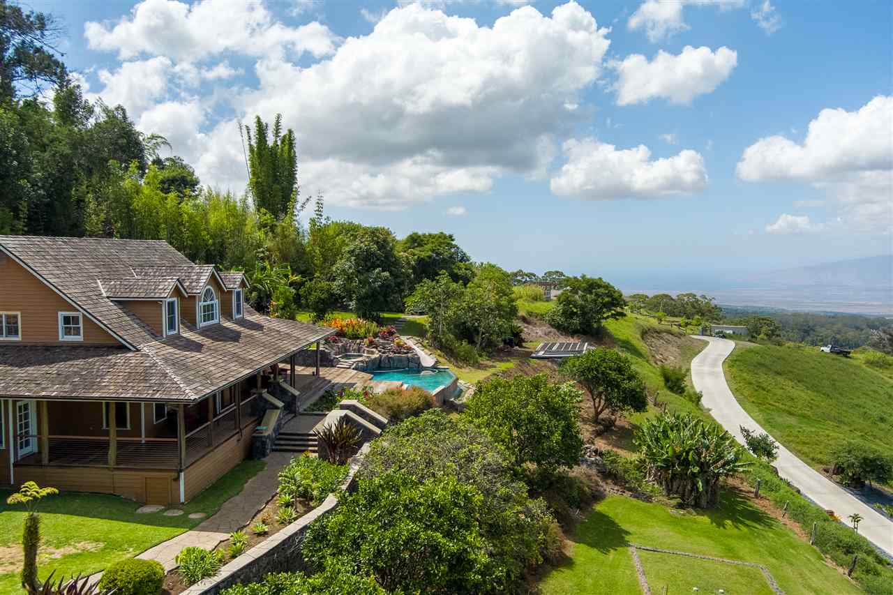 Welcome to this beautiful Olinda estate nestled half way up Olinda Rd on a completely private lot with INCREDIBLE views! The 2 acre lot is well planned out featuring a gorgeous 4000 sqft home right in the middle with a separate 1 bed/1 bath guest cottage off to one side. The kitchen of the main home is jaw dropping; with a huge koa island as the focal point. Koa cabinets and built in fridge and dishwashers covered in koa and artistic concrete countertops are all situated to enjoy the incredible bicoastal views from the wall of windows looking out from the kitchen. The family room with an impressive stone fireplace and the formal dining room are all open to the kitchen as well. There is a wonderful screened-in porch with a built-in grill that leads you to the outdoors and the sprawling Ipe deck, large enough to accommodate lawn chairs and an outdoor dining and then some. The infinity pool, along with it's spa, waterfall, and water slide (!!!) is an incredibly serene spot to enjoy the breath taking views. The main home has a master suite on the ground floor with a walk-in closet and a master bath dripping with natural stone. The downstairs flooring is beautifully finished mango along with the railings and stairs leading to the second level. There are 3 bedrooms and 2 full baths, as well as a second living room upstairs. Also on the ground floor is an incredibly impressive laundry room with 2 sets of laundry machines, a huge koa and mango wood island, and a walk-in wine cellar! The laundry room leads to the 3 car garage on one side, but it also has a separate entry door to the mother-in-law suite that sits above the garage. This 1 bedroom 1 bath suite with kitchenette is incredibly cute with it's soaring open beam ceilings and stunning views of the ocean and west Maui mountains. The property also boasts another separate 1 bedroom, 1 bath guest cottage with high ceilings, a loft, and it's own relaxing lanai overlooking the manicured grounds, the surrounding pasture lands, and down to the valley and beyond. This building would make an incredible office for those of you looking for a place to work from home yet separate from your main living space. Also in the back, nestled away from everything else under the soaring Eucalyptus trees that border the back of the property is approx. an 800 ft concrete slab with electrical run to it. The ground work is already completed for an art studio, car garage, barn, you name it! Many mature and producing citrus trees are on property as well as bananas and large beautiful avocados! Some nice features of the property are the owned solar panels, central heat/air, irrigation/sprinklers, and the filtered water system that is installed. If you're looking for a completely private estate that has big views with multiple living and working options come check this one out! More photos to follow soon.