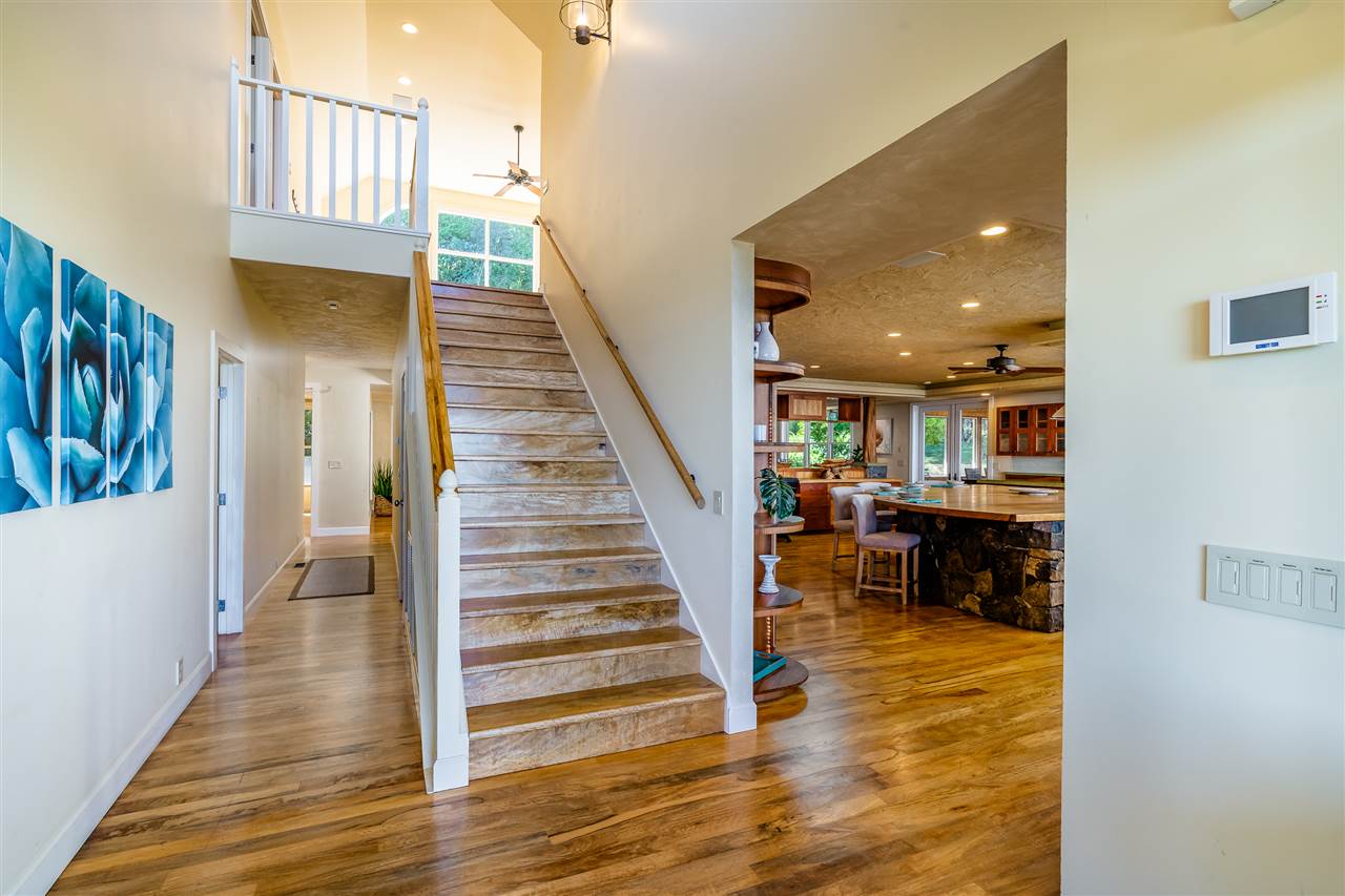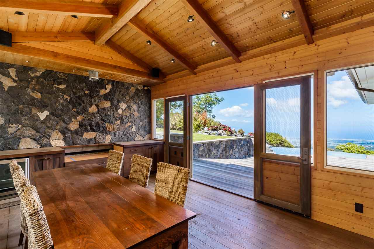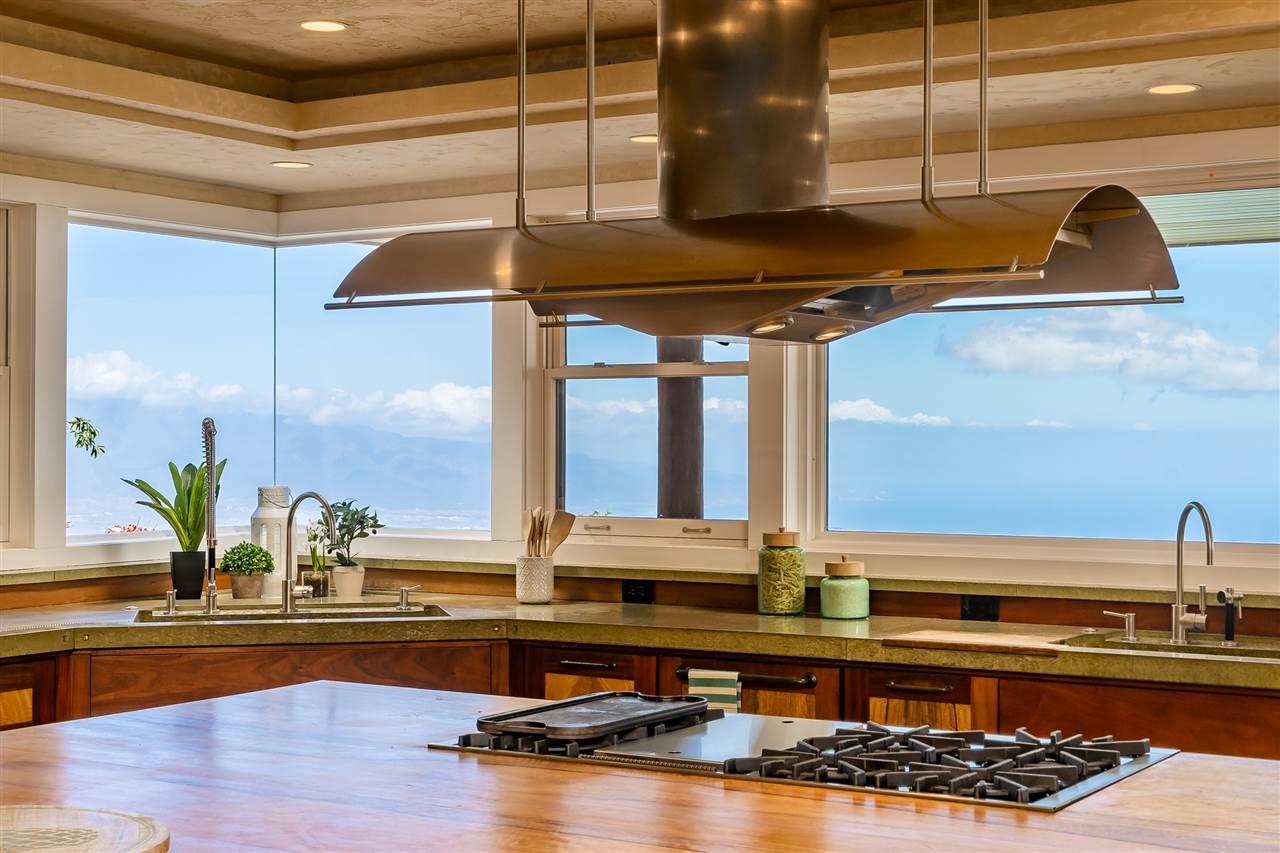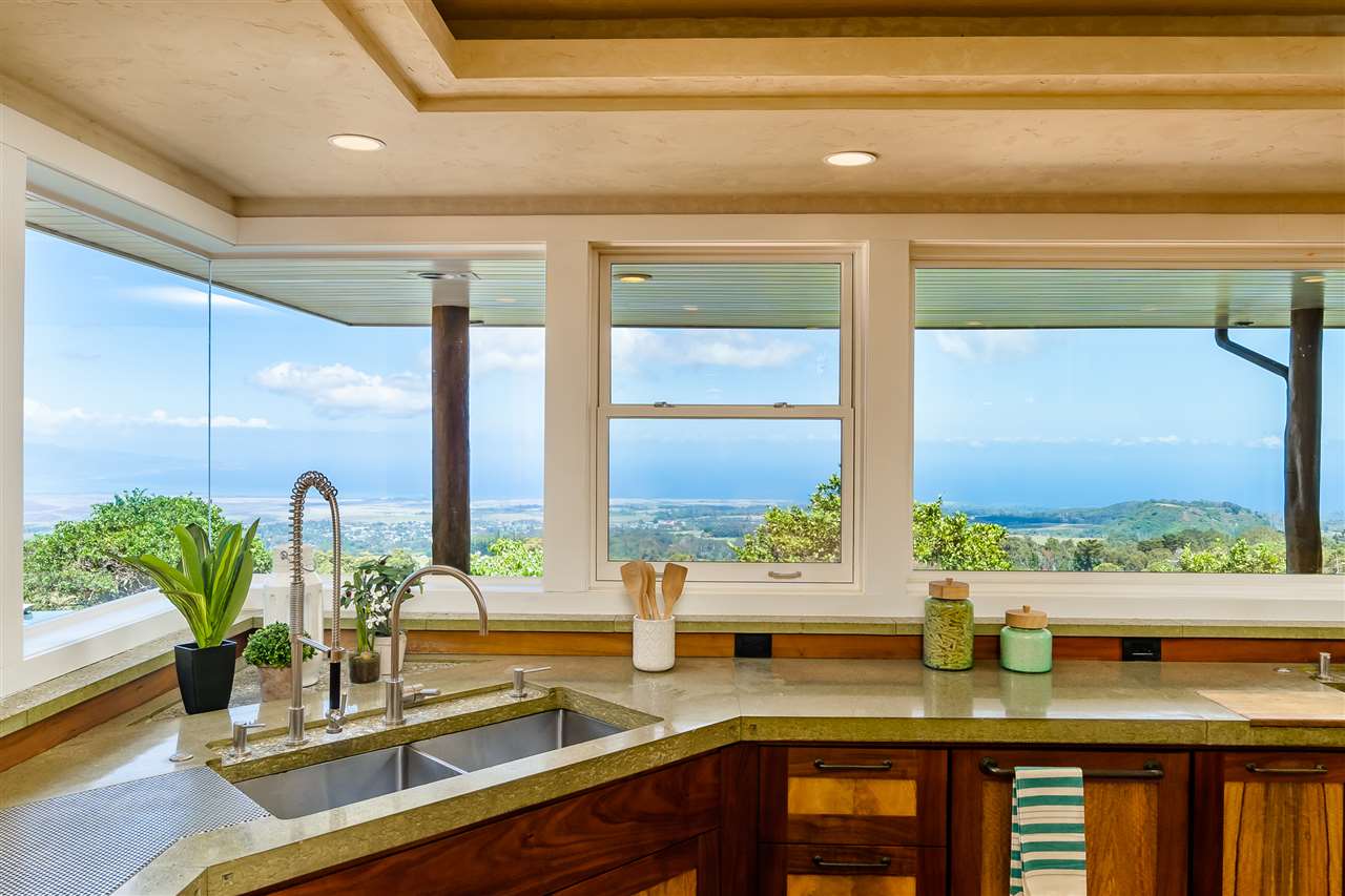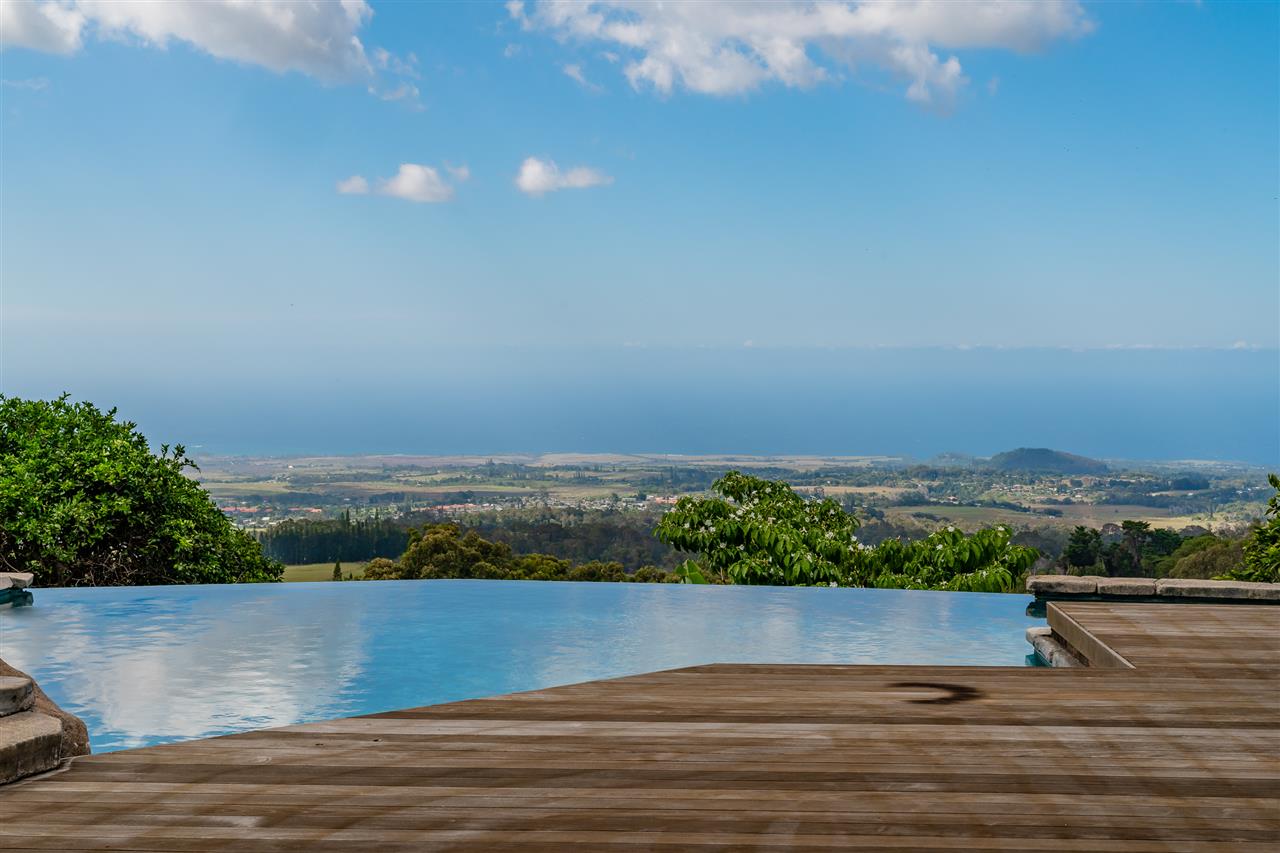Welcome to this beautiful Olinda estate nestled half way up Olinda Rd on a completely private lot with INCREDIBLE views! The 2 acre lot is well planned out featuring a gorgeous 4000 sqft home right in the middle with a separate 1 bed/1 bath guest cottage off to one side. The kitchen of the main home is jaw dropping; with a huge koa island as the focal point. Koa cabinets and built in fridge and dishwashers covered in koa and artistic concrete countertops are all situated to enjoy the incredible bicoastal views from the wall of windows looking out from the kitchen. The family room with an impressive stone fireplace and the formal dining room are all open to the kitchen as well. There is a wonderful screened-in porch with a built-in grill that leads you to the outdoors and the sprawling Ipe deck, large enough to accommodate lawn chairs and an outdoor dining and then some. The infinity pool, along with it's spa, waterfall, and water slide (!!!) is an incredibly serene spot to enjoy the breath taking views. The main home has a master suite on the ground floor with a walk-in closet and a master bath dripping with natural stone. The downstairs flooring is beautifully finished mango along with the railings and stairs leading to the second level. There are 3 bedrooms and 2 full baths, as well as a second living room upstairs. Also on the ground floor is an incredibly impressive laundry room with 2 sets of laundry machines, a huge koa and mango wood island, and a walk-in wine cellar! The laundry room leads to the 3 car garage on one side, but it also has a separate entry door to the mother-in-law suite that sits above the garage. This 1 bedroom 1 bath suite with kitchenette is incredibly cute with it's soaring open beam ceilings and stunning views of the ocean and west Maui mountains. The property also boasts another separate 1 bedroom, 1 bath guest cottage with high ceilings, a loft, and it's own relaxing lanai overlooking the manicured grounds, the surrounding pasture lands, and down to the valley and beyond. This building would make an incredible office for those of you looking for a place to work from home yet separate from your main living space. Also in the back, nestled away from everything else under the soaring Eucalyptus trees that border the back of the property is approx. an 800 ft concrete slab with electrical run to it. The ground work is already completed for an art studio, car garage, barn, you name it! Many mature and producing citrus trees are on property as well as bananas and large beautiful avocados! Some nice features of the property are the owned solar panels, central heat/air, irrigation/sprinklers, and the filtered water system that is installed. If you're looking for a completely private estate that has big views with multiple living and working options come check this one out! More photos to follow soon.