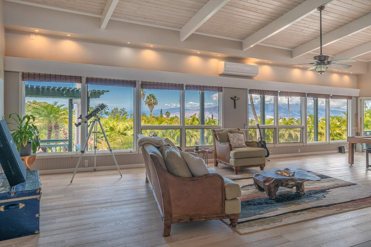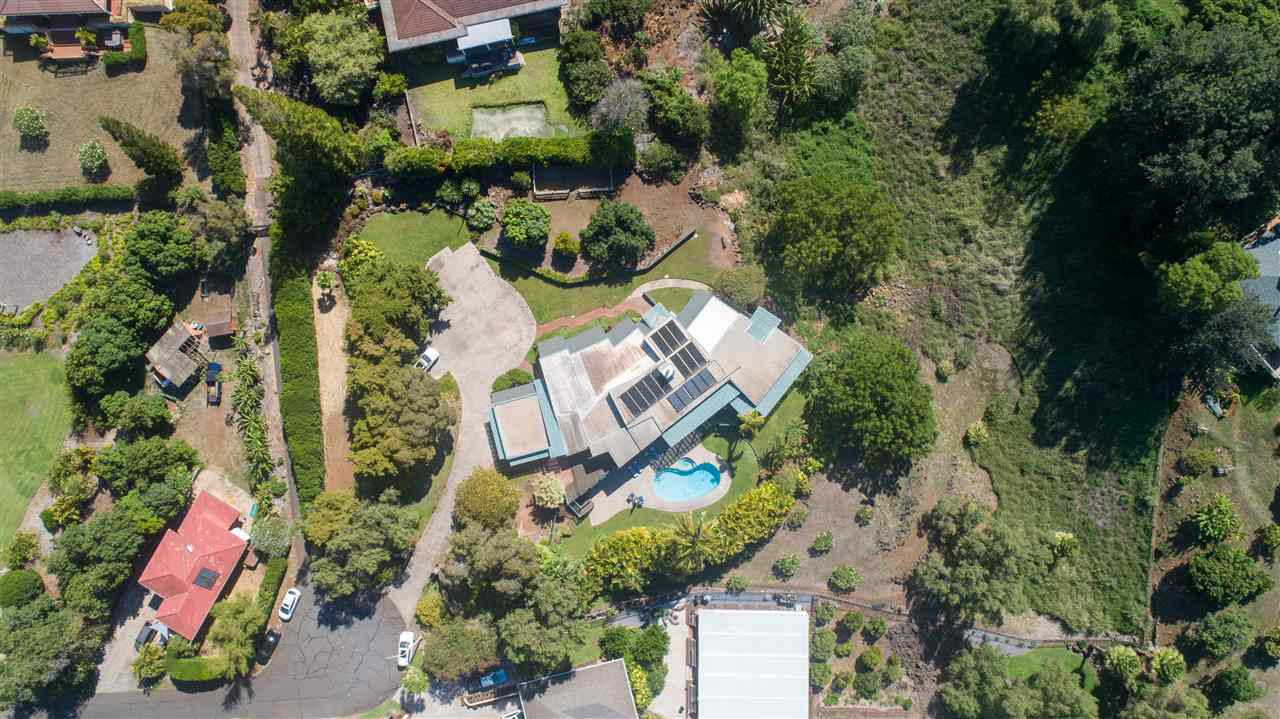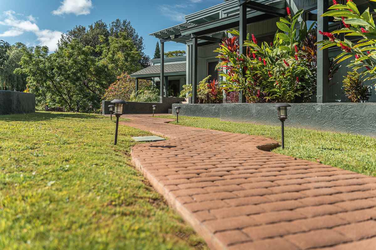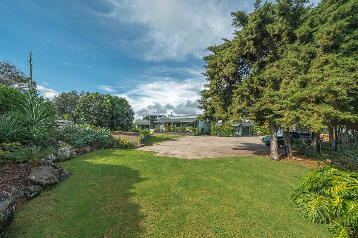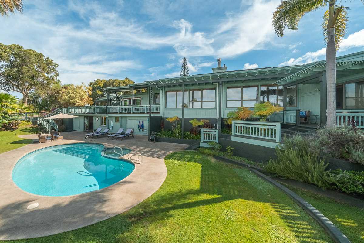 Located at the ideal elevation of 2100 ft., this beautiful, gated property offers 4 bedrooms & 4 baths, open beam ceilings, wainscoting, numerous windows create an atmosphere of bright spacious living. The main living area includes a large living room, dining area & cozy fireplace. The master suite is positioned for privacy & includes a master bath complete with a deep soaking tub, walk-in shower, dry sauna, & double vanity. The dressing room has 3 closets, 1 walk-in, built-in cabinetry & and many mirrors including a great makeup sitting area. Step down to the office & master bedroom both with private lanais. 3 large bedrooms, 1 ensuite, plus additional bath, are located on the upper level. The house was remodeled in 2019/2020 with brand new hardwood flooring throughout and fully remodeled master bath. A focal point of the home is the chefs kitchen with adjoining family room that opens onto the spacious ironwood lanai overlooking the pool, perfect for those colorful sunsets! Stairs lead down to the oversized concrete deck surrounding the solar heated pool & spa. Adjacent to the pool is the recently remodeled cabana/studio/in-law suite with full kitchen, bath/laundry room. The unfinished basement provides enormous storage & work space, and would make a great wine cellar. There are two solar water heaters & a Pelican Home Water Filtration System. Separate 2 car garage & large parking area. This property is nicely landscaped with mango, papaya, citrus, avocado & over 20 plumeria trees lending to the tranquil nature of this special property. The icing on the cake is the 2 Iron Wood Gates, one electric with Doorbird Keypad/camera (Wifi for remote entry) Do not wait for this one, call your favorite REALTOR to schedule a safe and private showing today!