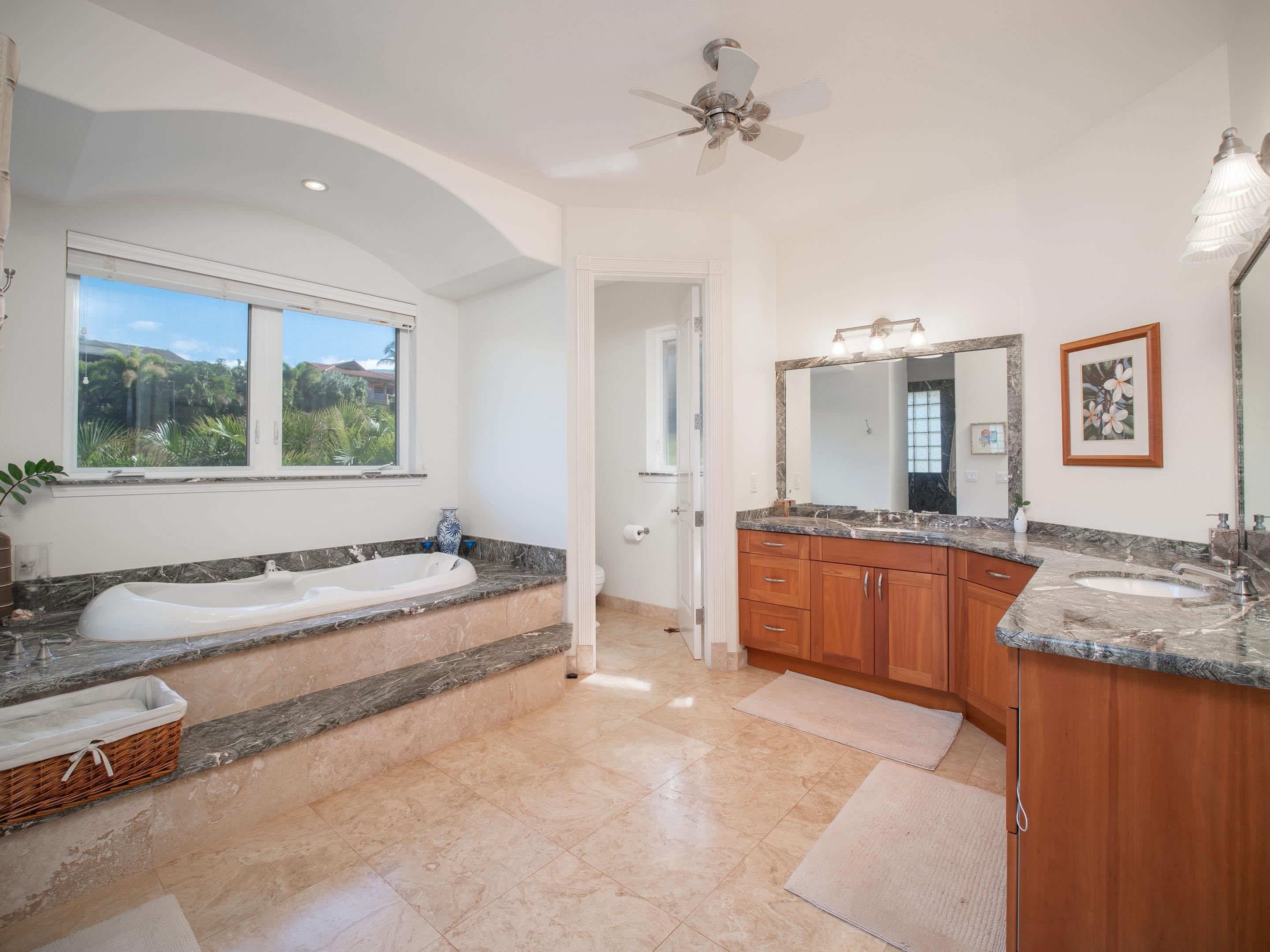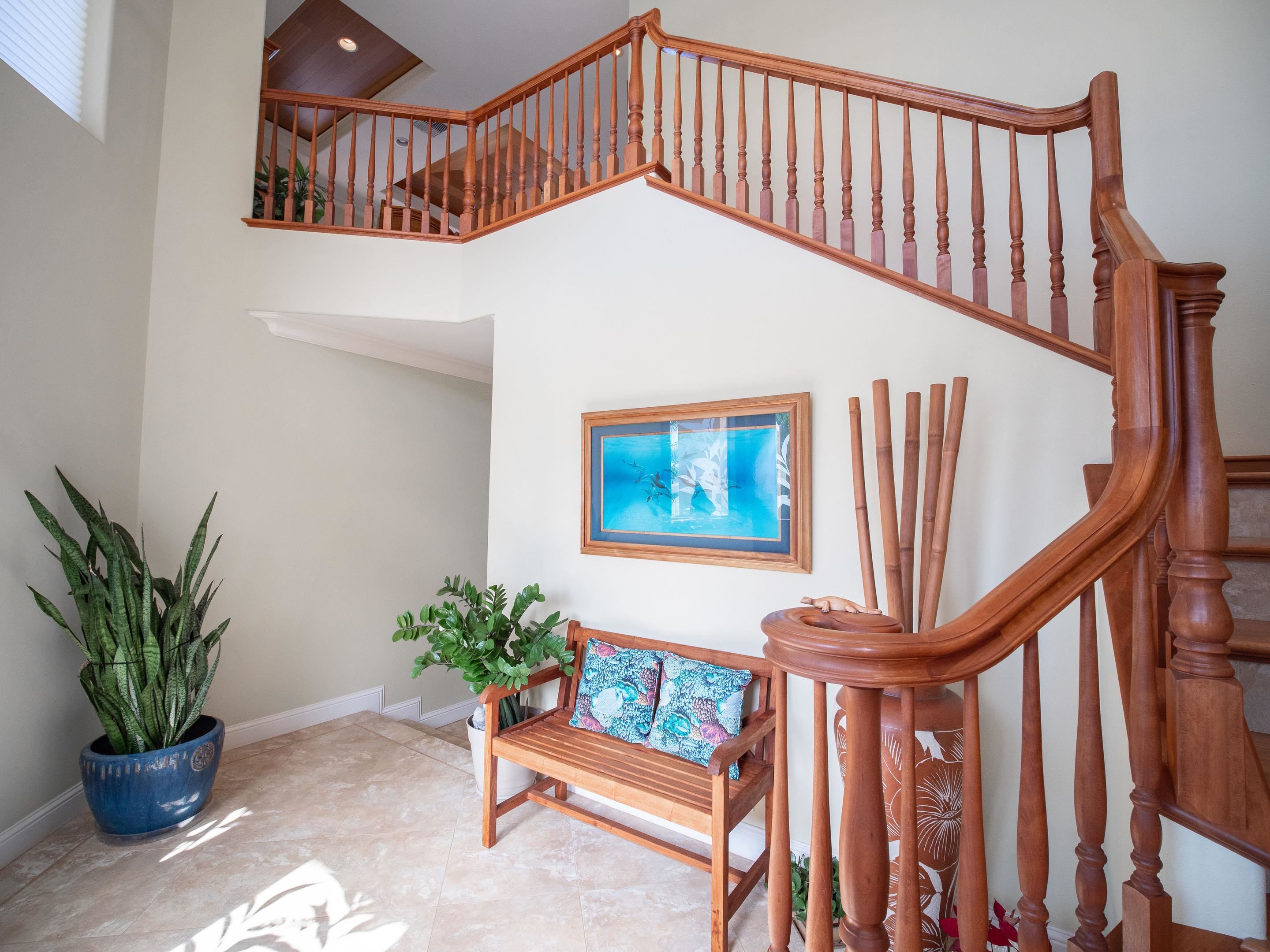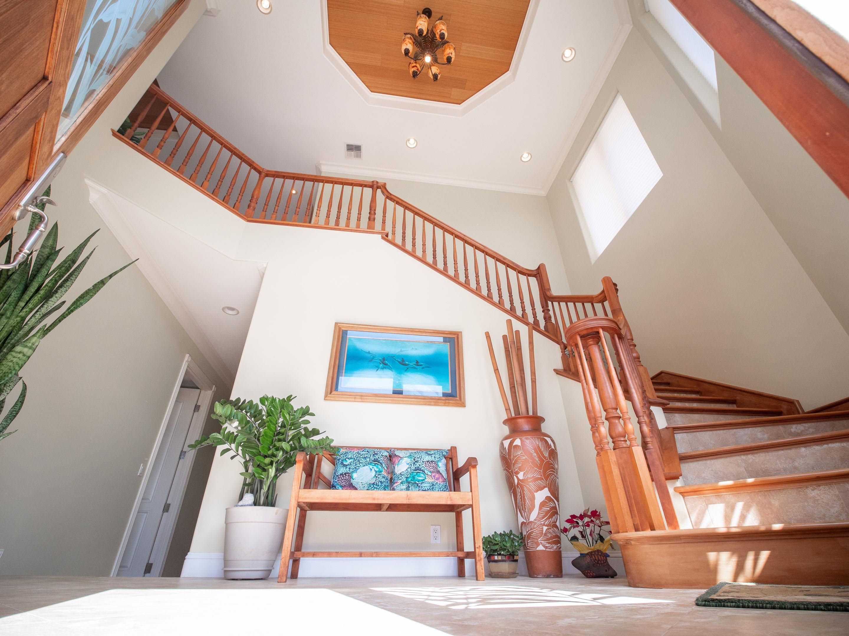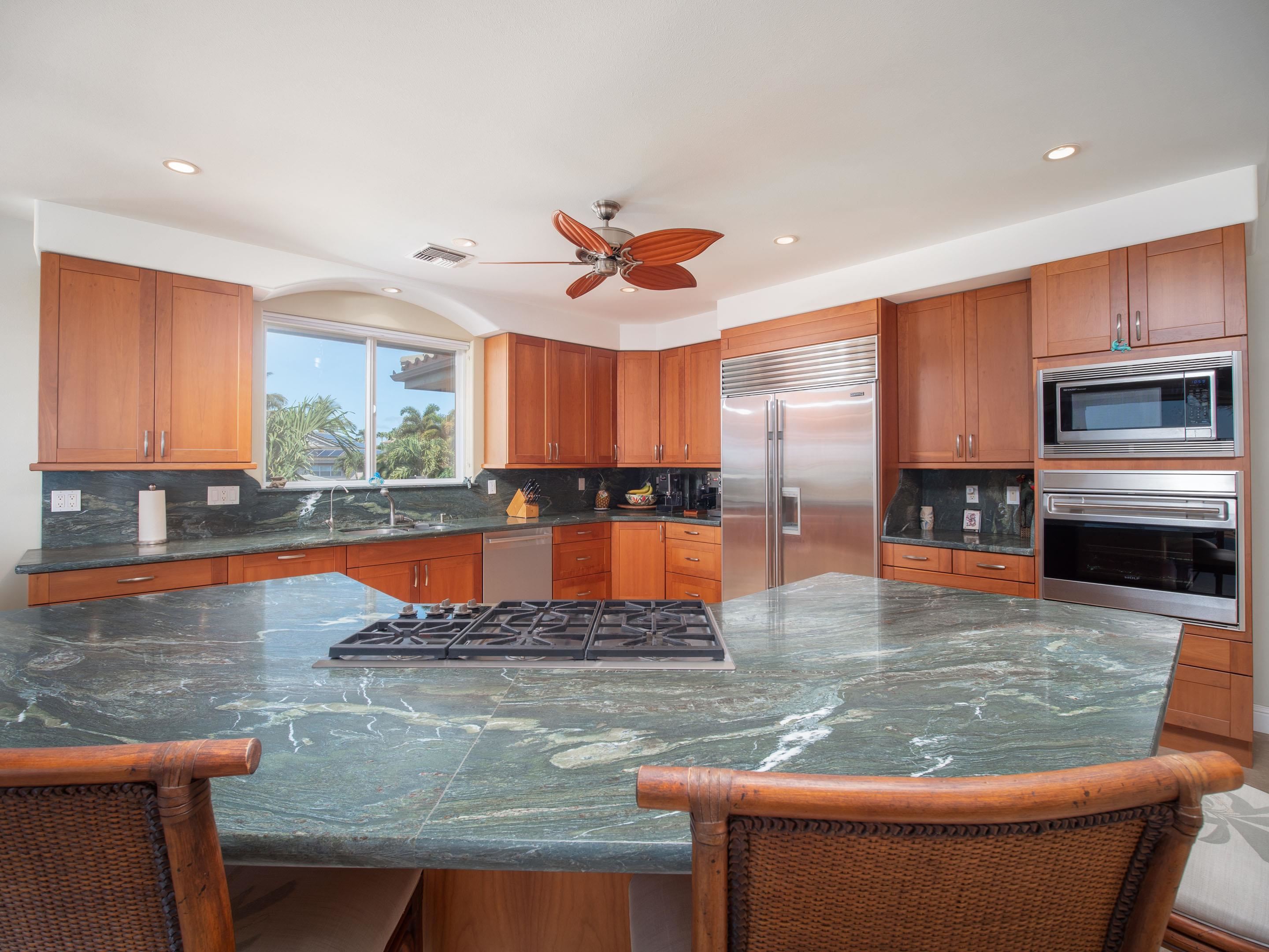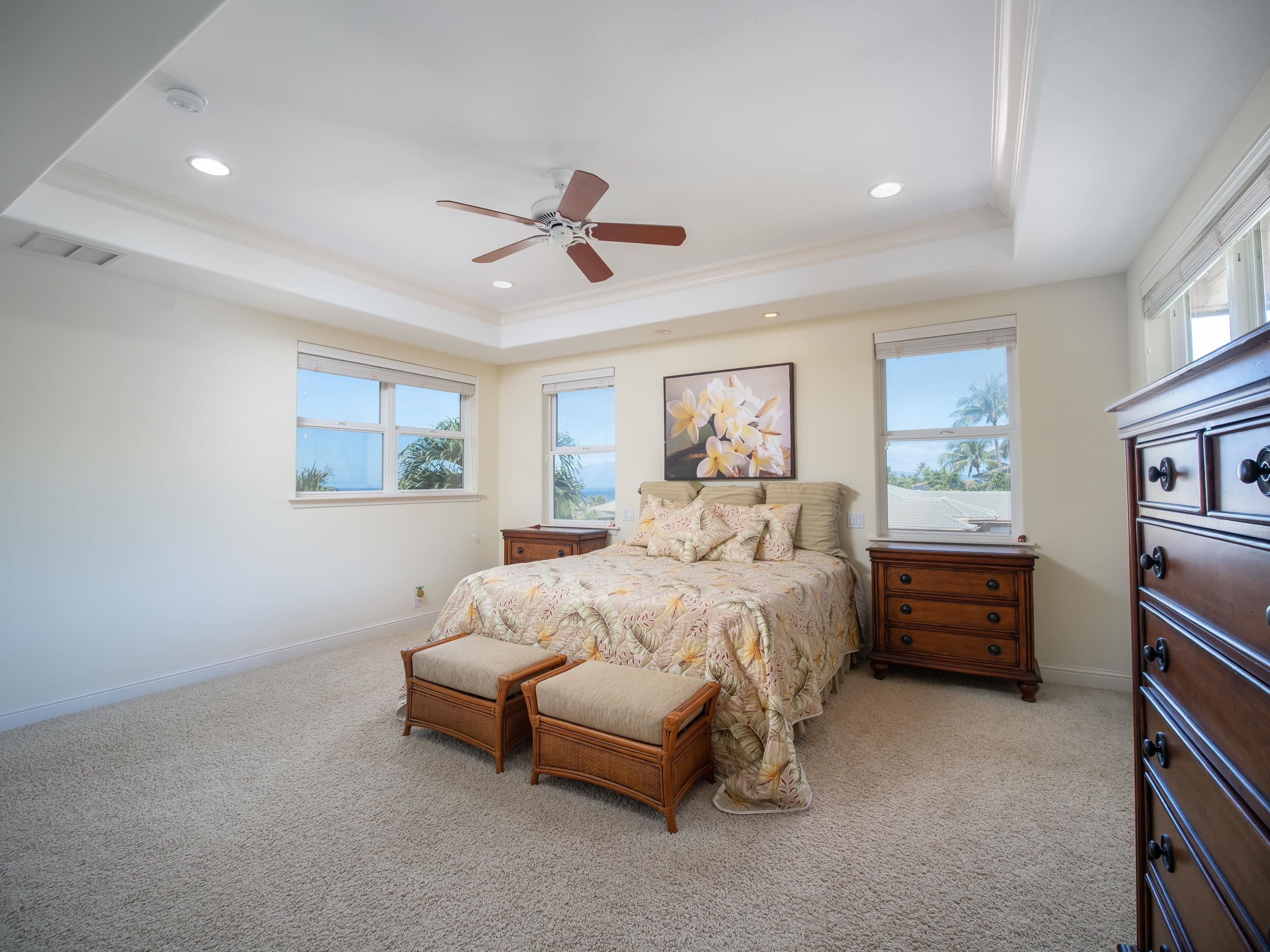 If you seek a quality home, in one of the most prestigious neighborhoods in West Maui, with beautiful ocean views, you found it! This island home in the gated community of Kaanapali Golf Estates, with sweeping views of the ocean, Lanai and Molokai, is being sold turnkey and furnished. With the kitchen and living upstairs, you'll love the large open plan living area which opens up to a huge lanai looking direct west for spectacular lingering West Maui sunsets each evening. Custom home with high end features including rain forest granite, Cherry Cabinets, smooth Italian porcelain tiled floors, Limestone and Travertine in bathrooms. Gourmet kitchen equipped with Wolf gas stove, microwave and oven, Subzero refrigerator and Bosch dishwasher. Living Room has 10' ceilings with accent bamboo and pocket Fleetwood doors which open to the wide covered lanai for a seamless indoor/outdoor living environment. The indoor laundry room houses the dumb waiter. And just minutes away you'll enjoy some of the best beaches in the world, 5-star resorts, restaurants, shops, and world-class golf, all just down the hill from your new home!