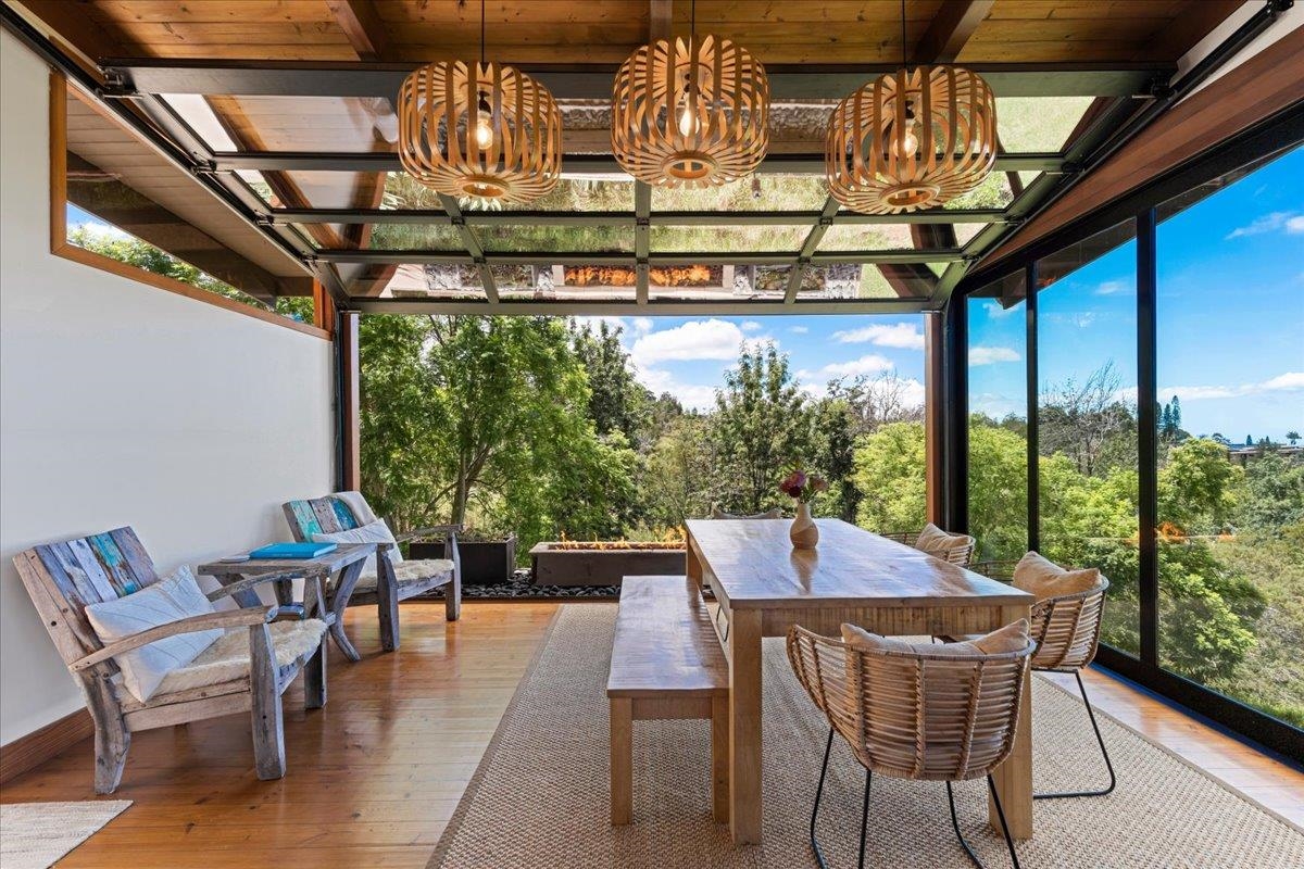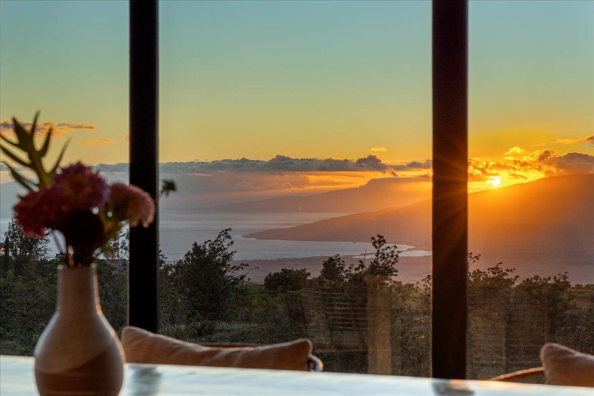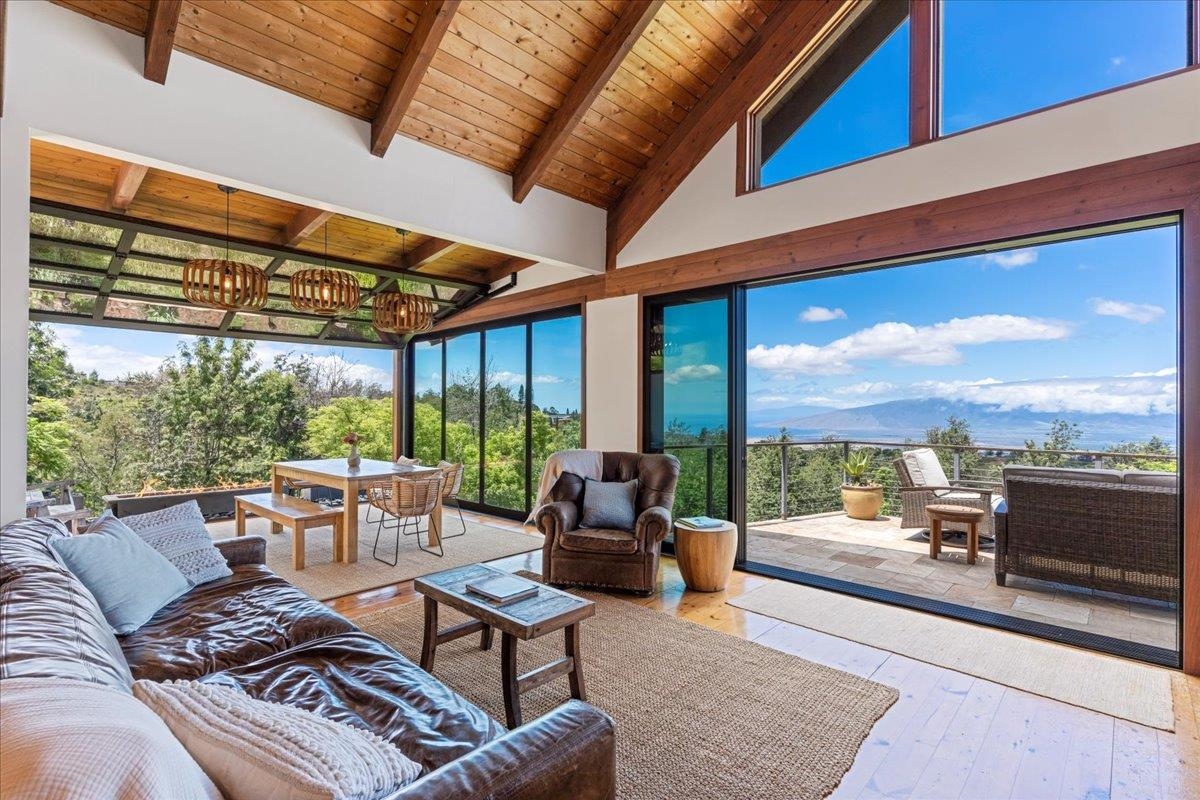 Experience the perfect blend of elegance and modernity in this contemporary 4-bedroom, 3-bathroom home, offering breathtaking bi-coastal ocean views, set on 1.4 acres in Lower Kula, Maui. This upscale property boasts two expansive lanais: one with a stacking glass wall that opens to a front ocean view deck, and another side deck ideal for entertaining. A 16-foot glass garage door opens to reveal mesmerizing vistas and a fire pit, creating a dreamy living room atmosphere. Inside, you'll find hardwood floors, chic light fixtures, a spacious kitchen island, abundant natural light, and a welcoming ambiance. The updated bathrooms feature luxurious tile and stone finishes. The terraced and irrigated yard, complete with citrus trees and a hot tub, offers a serene private oasis. Additional comfort is provided by a downstairs guest suite. Convenience is key with a separate laundry room and gear storage area. Discover the best of Upcountry living in this sleek and sophisticated home.