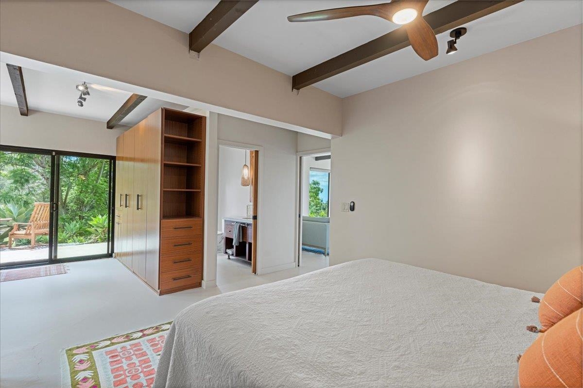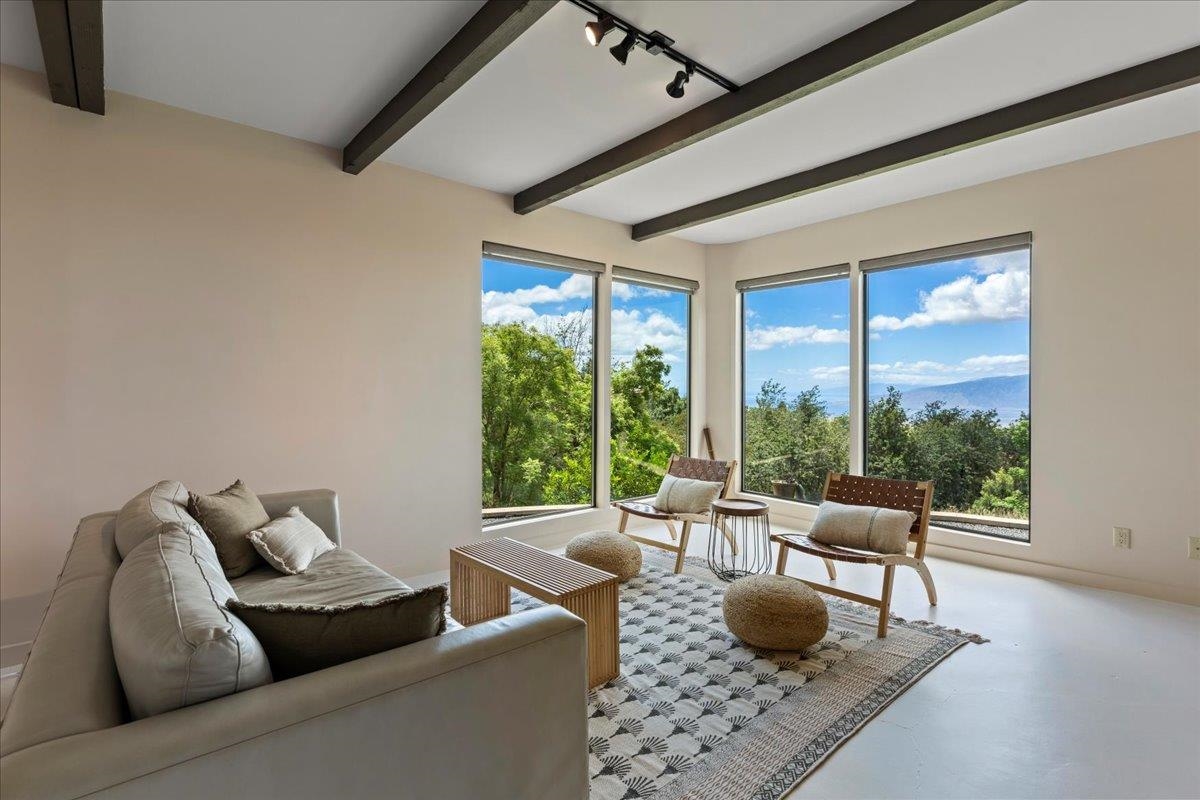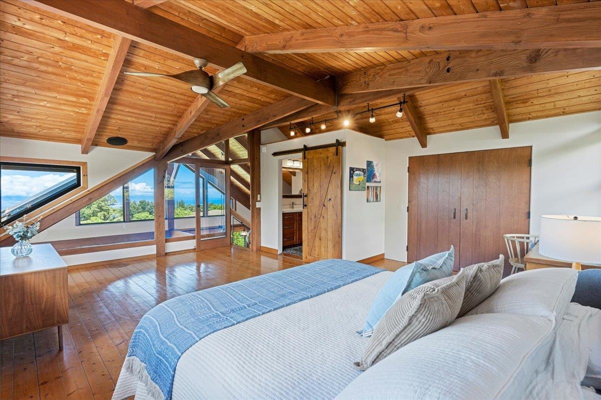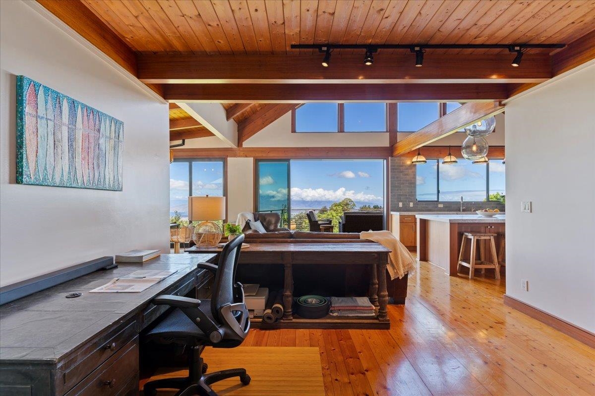 Experience the perfect blend of elegance and modernity in this contemporary 4-bedroom, 3-bathroom home, offering breathtaking bi-coastal ocean views, set on 1.4 acres in Lower Kula, Maui. This upscale property boasts two expansive lanais: one with a stacking glass wall that opens to a front ocean view deck, and another side deck ideal for entertaining. A 16-foot glass garage door opens to reveal mesmerizing vistas and a fire pit, creating a dreamy living room atmosphere. Inside, you'll find hardwood floors, chic light fixtures, a spacious kitchen island, abundant natural light, and a welcoming ambiance. The updated bathrooms feature luxurious tile and stone finishes. The terraced and irrigated yard, complete with citrus trees and a hot tub, offers a serene private oasis. Additional comfort is provided by a downstairs guest suite. Convenience is key with a separate laundry room and gear storage area. Discover the best of Upcountry living in this sleek and sophisticated home.