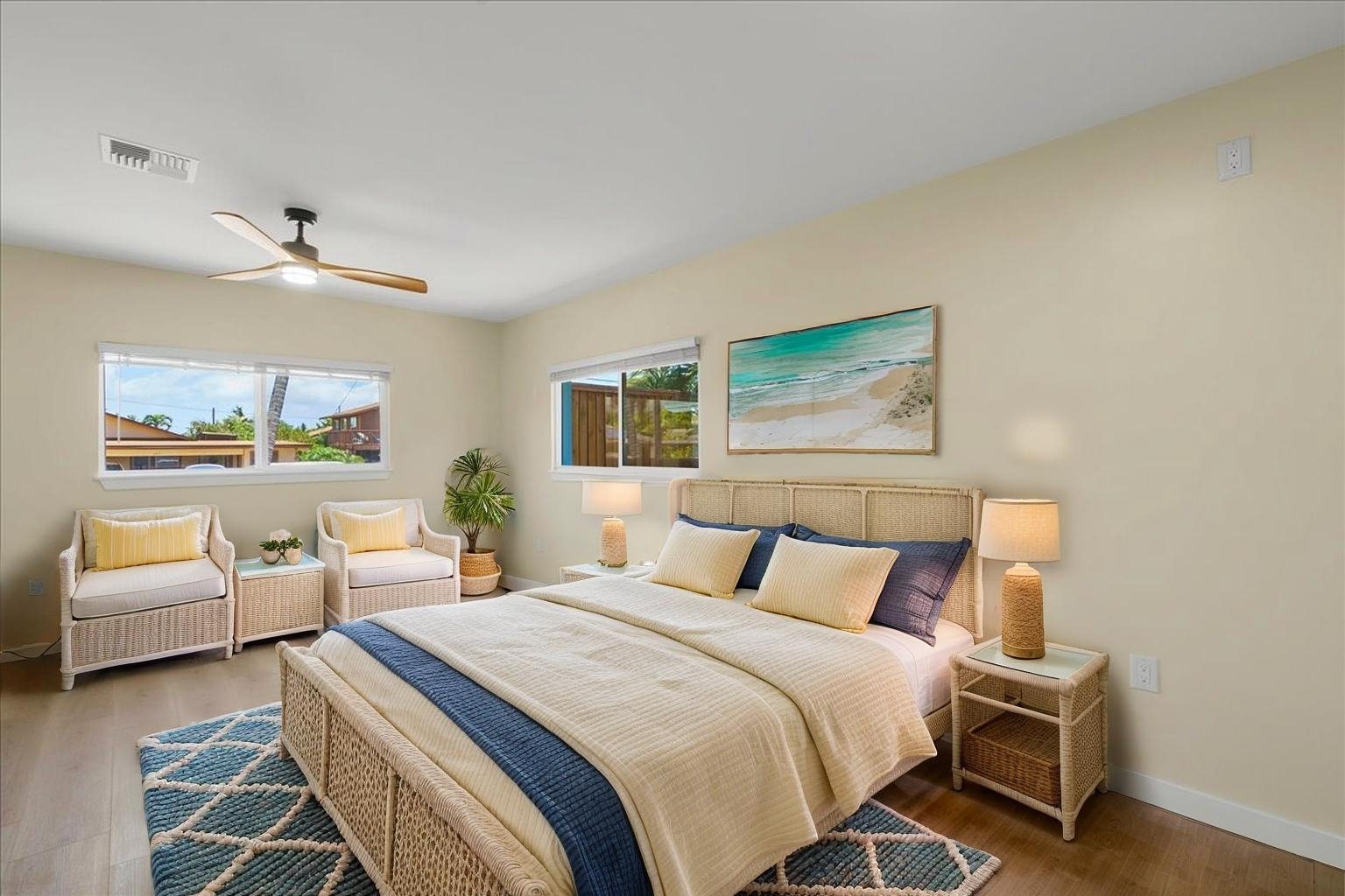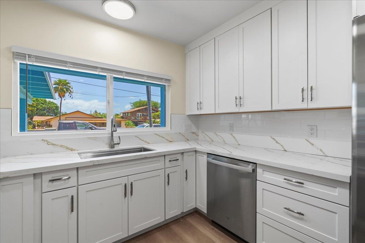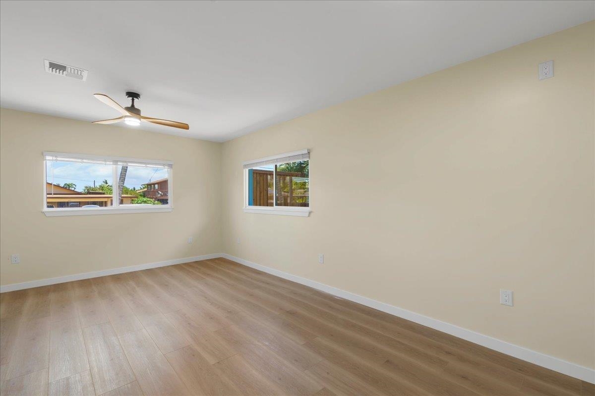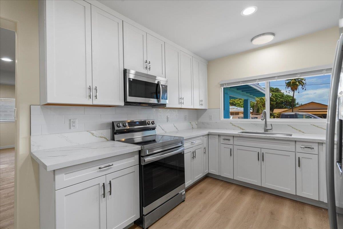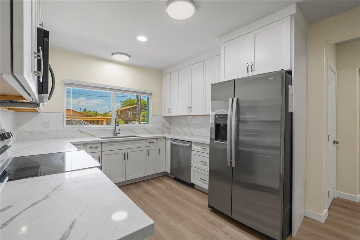 Located on the beautiful Island of Maui, this fully renovated home offers the perfect blend of comfort, style, and future flexibility. Nearly every aspect of the home has been rebuiltonly the original block walls remain. Enjoy peace of mind with brand-new electrical wiring and panel, copper plumbing, and a 30-year roof. The exterior boasts new stucco, energy-efficient windows and doors, and a fresh coat of paint. Step inside to find 12mm Hawaiian Premium LVP flooring throughout, a stunning new kitchen with quartz countertops, custom cabinets, and new appliancesall included. The oversized bathroom is designed for accessibility and features a walk-in shower, a custom-ordered Kohler cast iron tub, Moen fixtures, and Bluetooth-enabled vent fans. An electric water heater adds to the modern conveniences. Additional highlights include an attached two-car carport, a covered front porch, and pre-run plumbing to the backyardready for a future Ohana unit. This is truly a turn-key Maui property, offering exceptional quality and potential in one of the worlds most desirable locations.