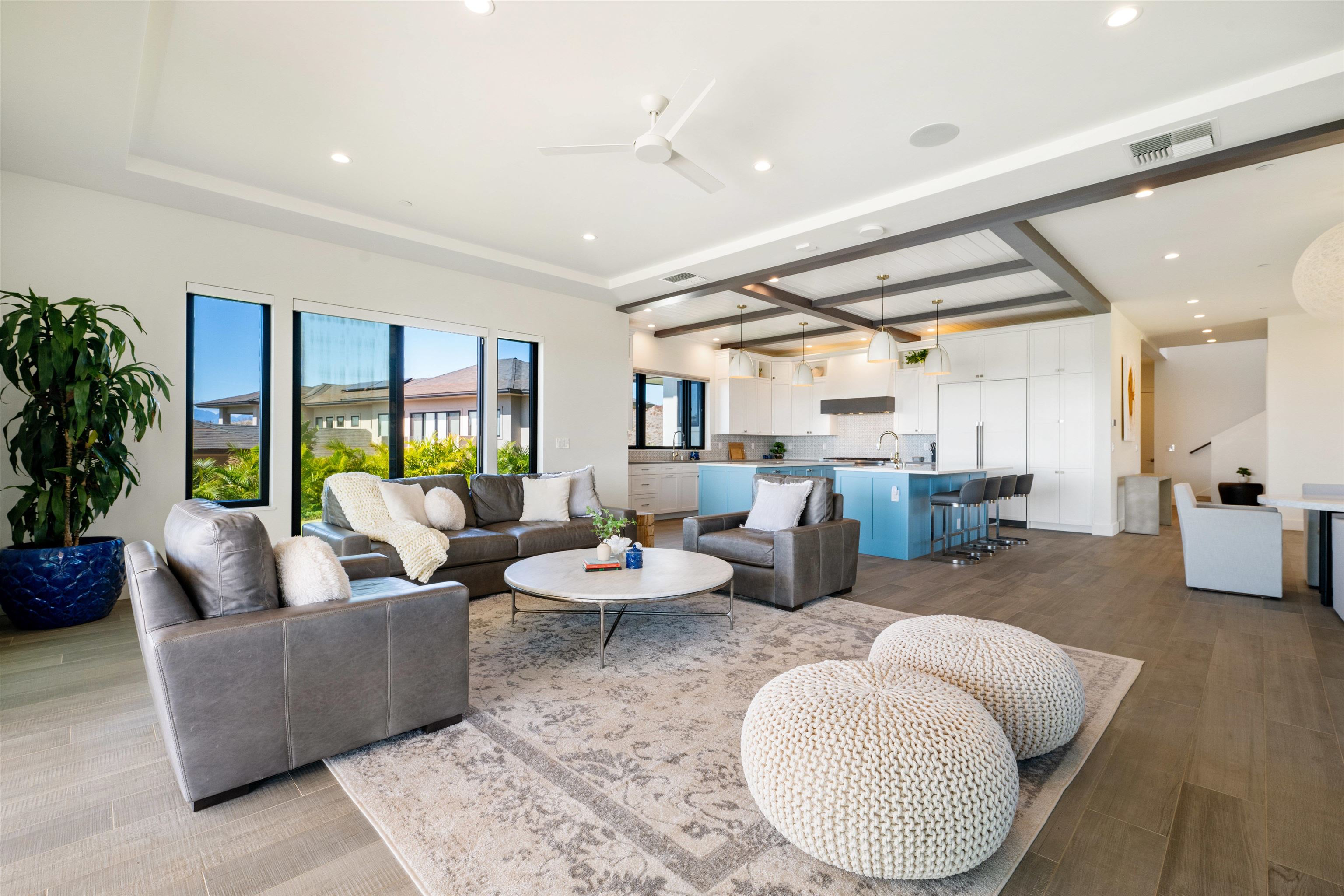 Nestled within the prestigious gated Lanikeha community on Maui, 804 Anapuni Loop presents an exceptional long-term rental opportunity, offering panoramic vistas of Moloka'i and Lana'i. Constructed in 2023, this contemporary 6,300-square-foot residence seamlessly integrates modern design with island sophistication, highlighted by a 4,260-square-foot primary structure. The gourmet kitchen serves as a focal point, featuring crisp white cabinetry accented by a bold blue island and premium Thermador appliances for efficient, high-end meal preparation. Expansive pivoting glass doors open to a covered lanai and infinity-edge pool, creating an ideal setting for evening gatherings as the sun sets over the Pacifican entertainer's haven designed for memorable occasions. Lease Details: – Pets: OK – Pet Deposit: Yes – Lease duration: 6 months – 1 year+ – Furnished – A/C – Garage & Driveway parking – No Smoking Utilities Included: garbage, landscaping, pool service. Tenant Pays for: water, sewer, electricity, internet, cable, pest.